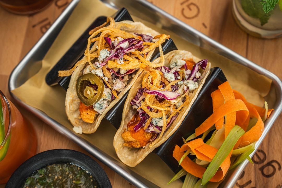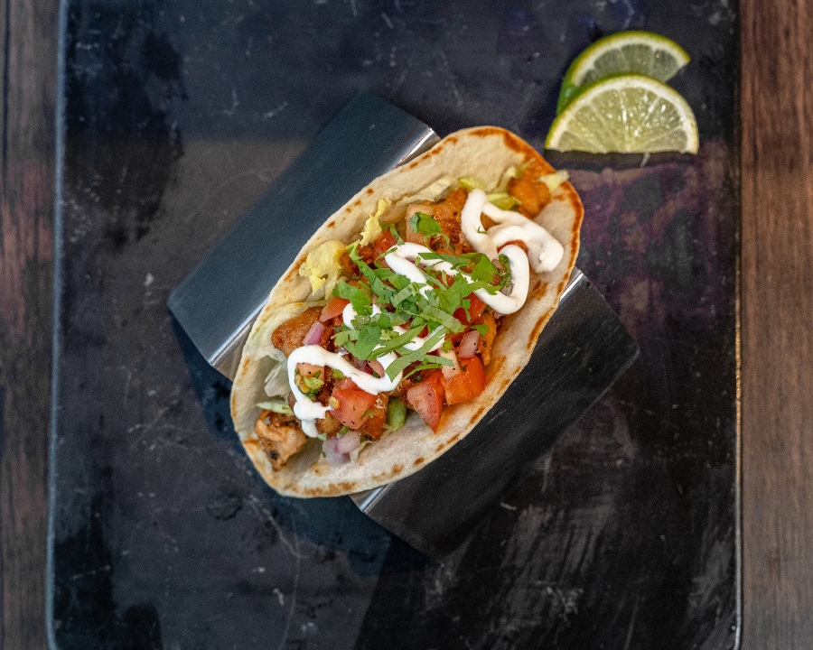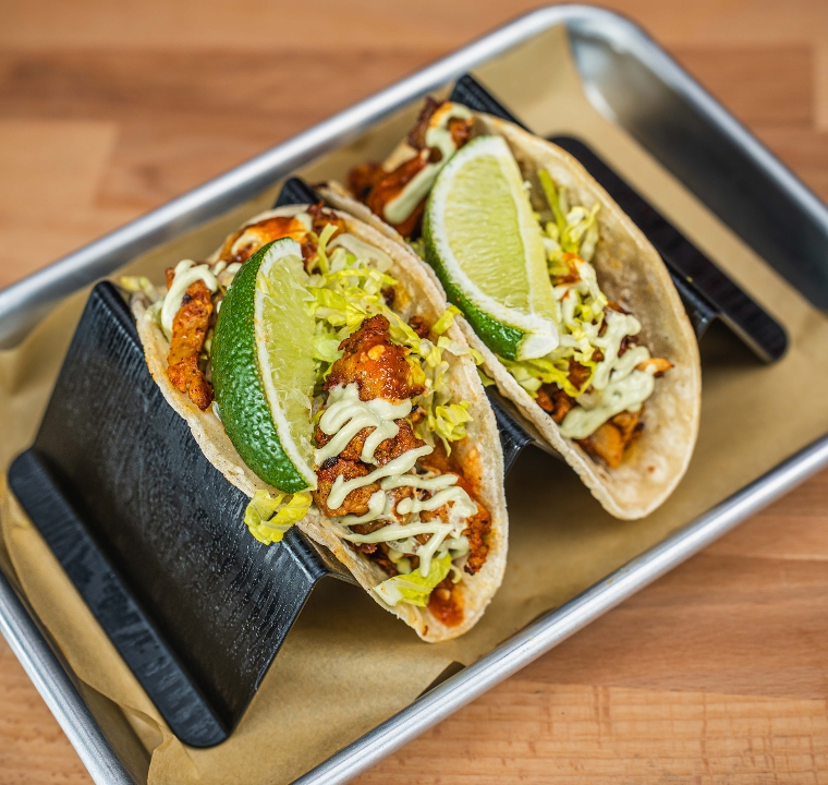 crispy fried chicken, jerk chicken sauce, lime crema, pickled onion, lettuce