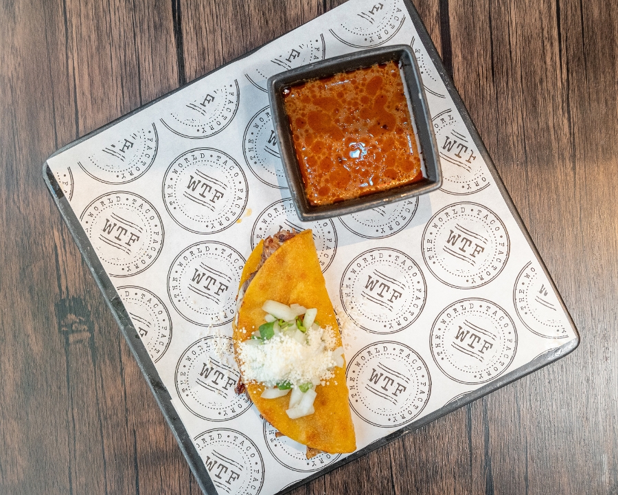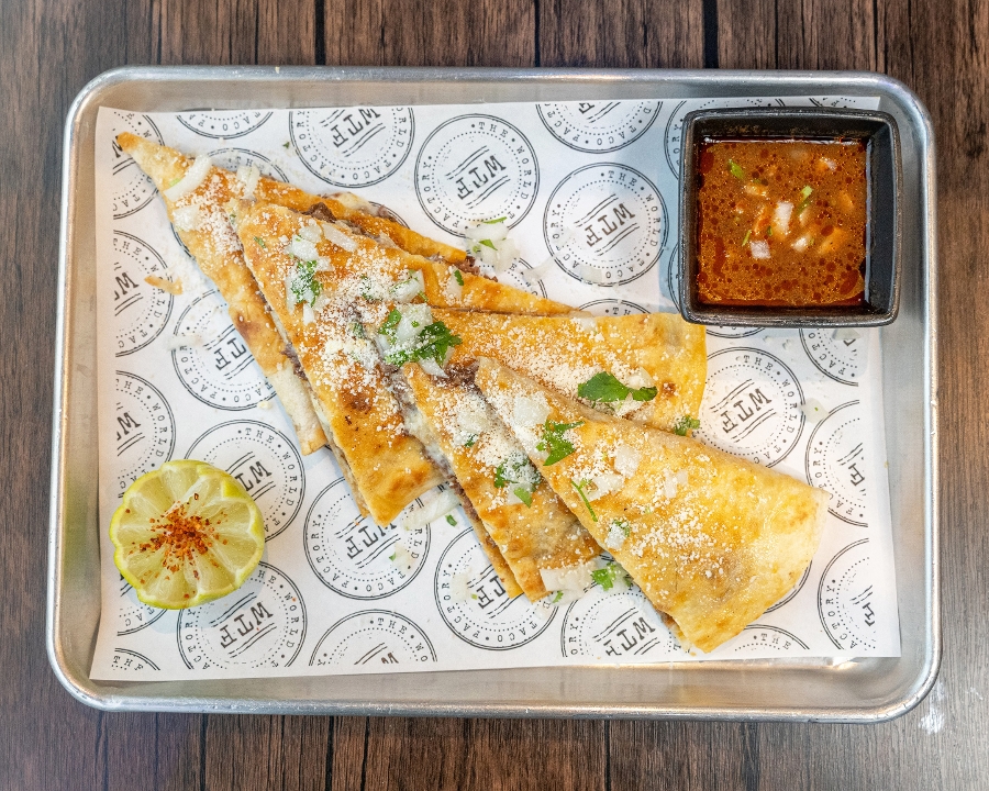 slow roasted shredded beef in a semi-crispy corn tortilla with oaxaca and cotija cheeses with a side of consommé