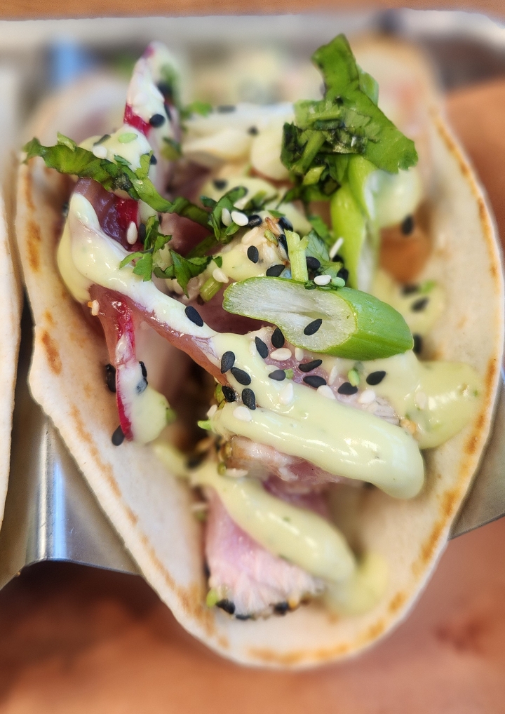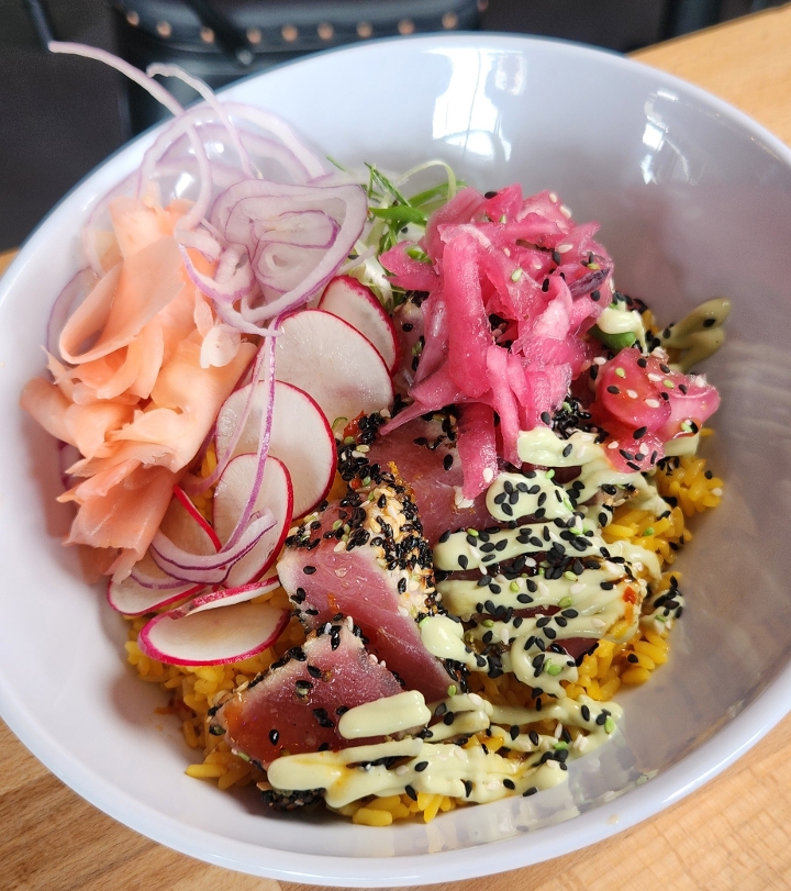 Sashimi grade tuna (raw)*, green onion, radish, pickled ginger, sesame garlic, avocado sauce, toasted sesame, pickled onion, Wasabi drizzle
