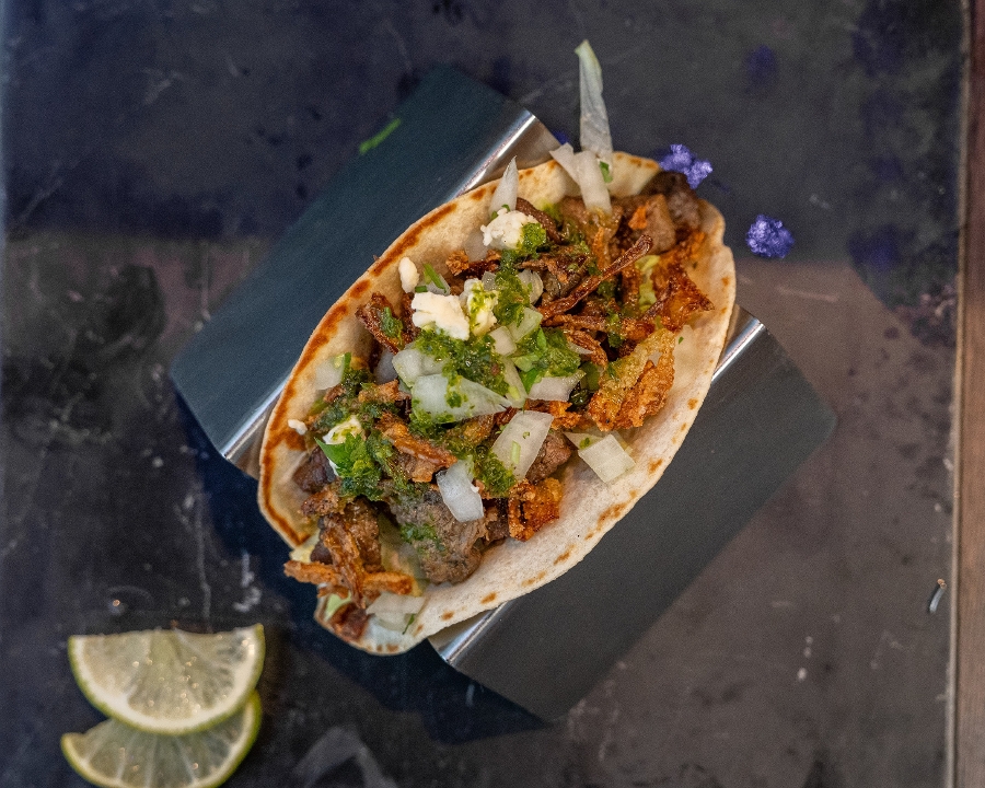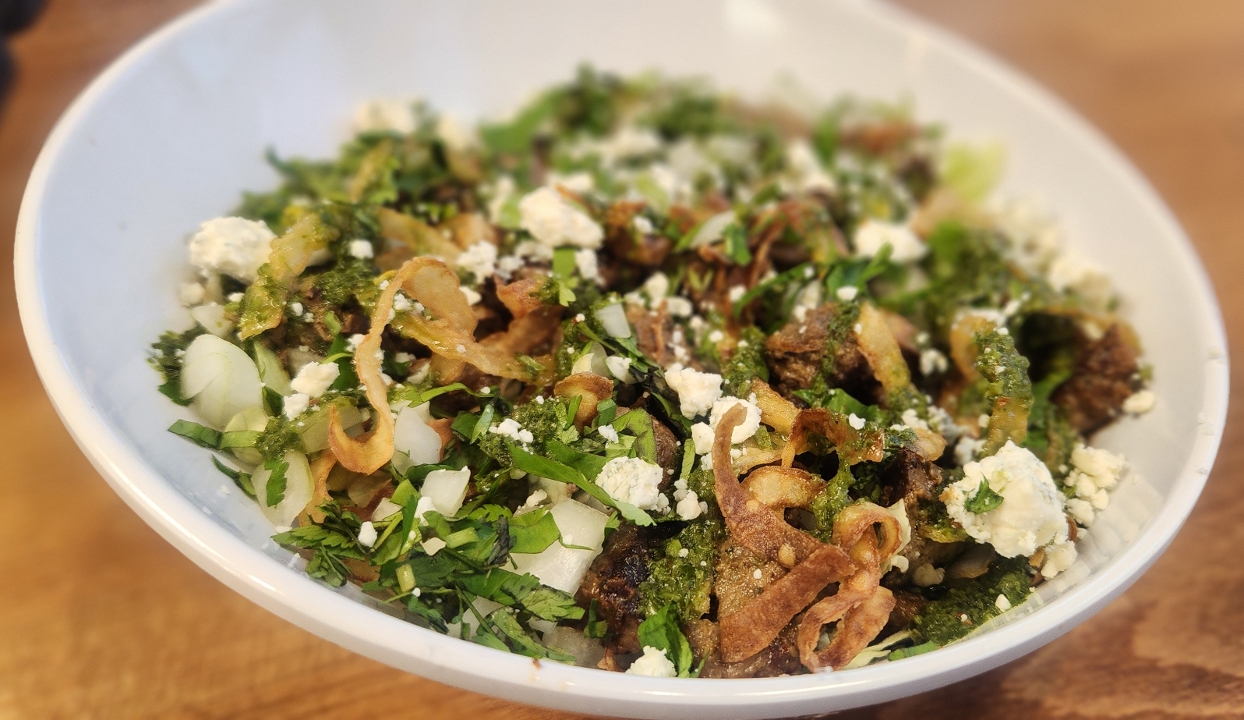 marinated & grilled steak, frizzled onions, gorgonzola cheese, onion & cilantro mix, chimichurri