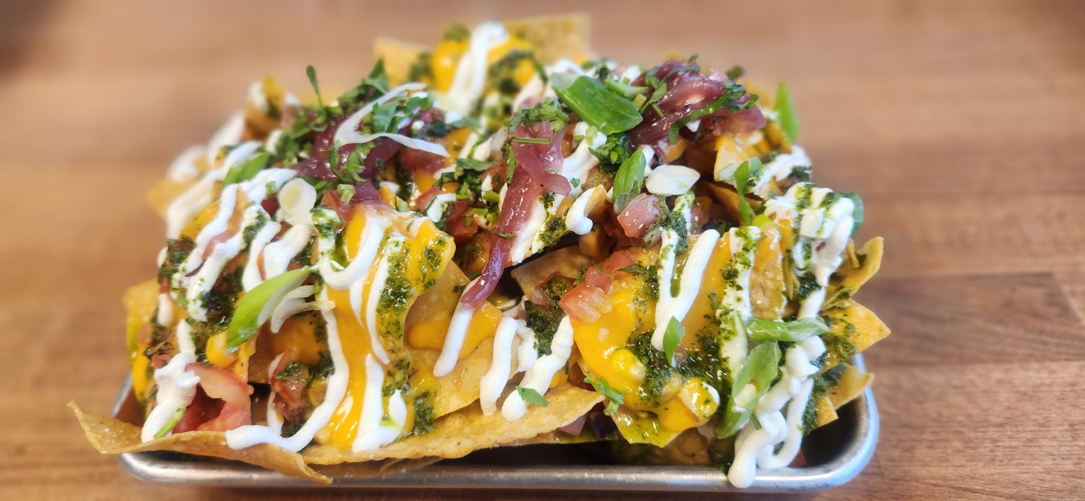 Tortilla chips layered with queso blanco, roasted corn pico, lime crema and housemade chimicurri sauce