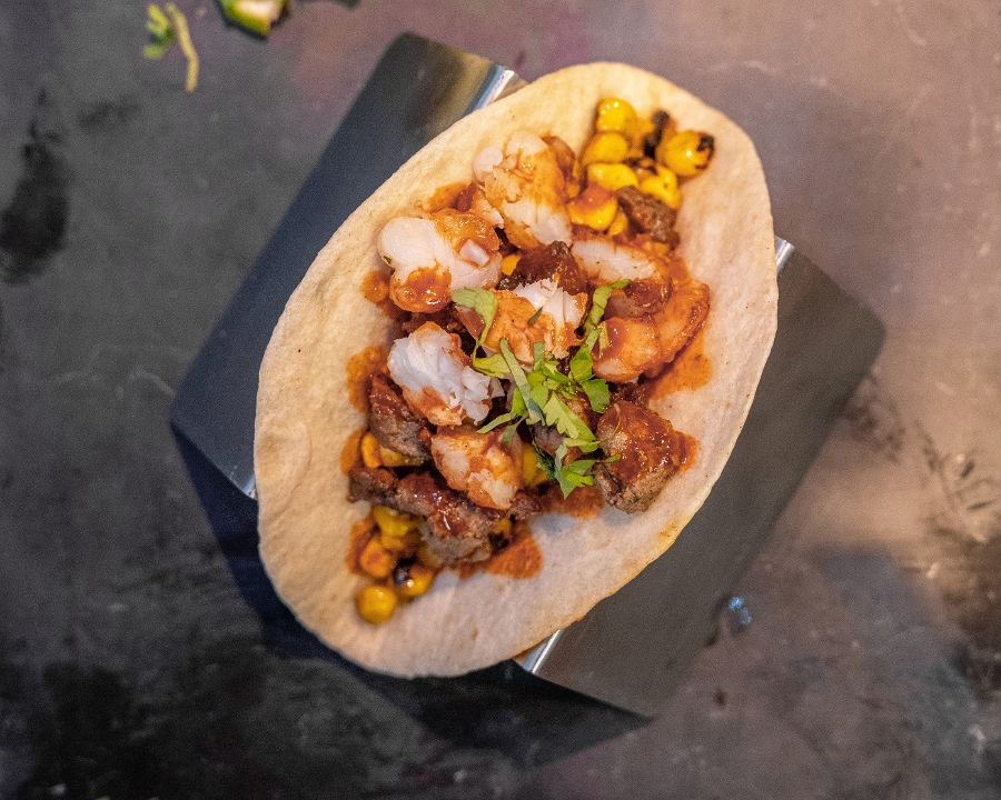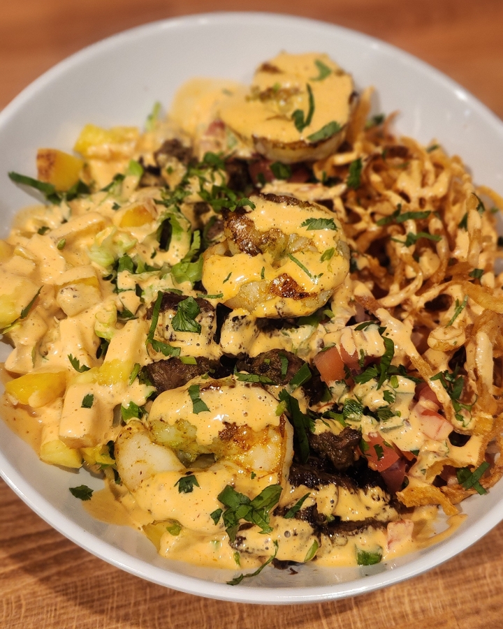 grilled steak and grilled shrimp, beans, frizzled onions, onion and cilantro mix, special house sauce