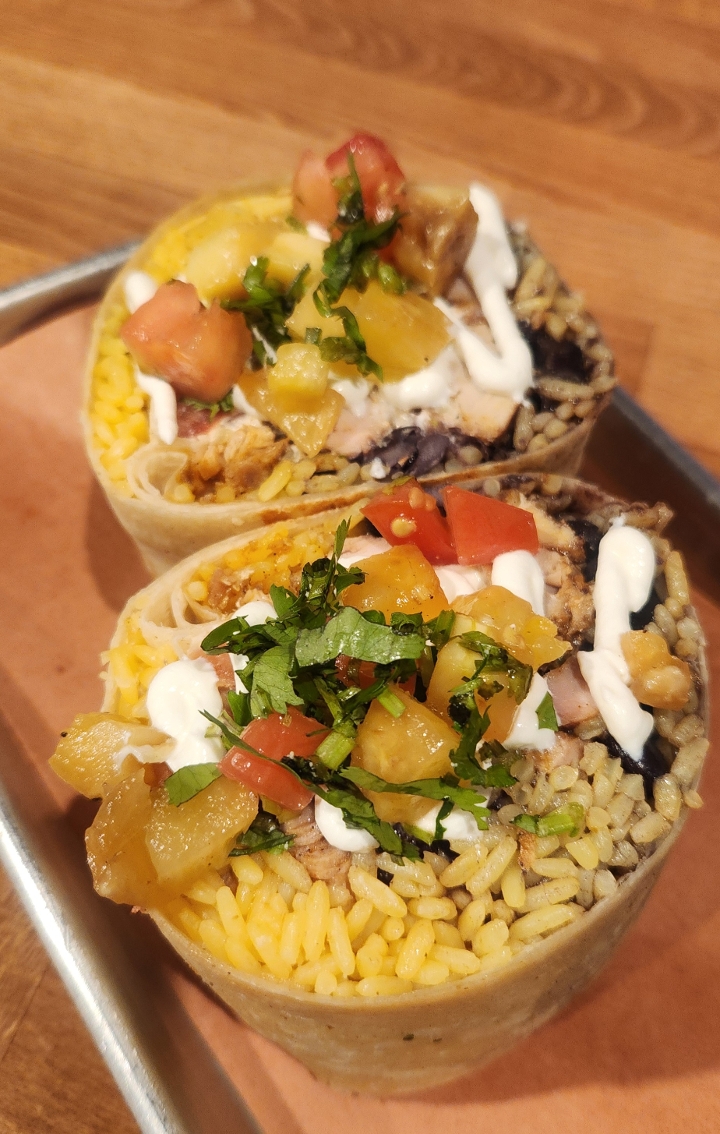Chicken fajita bowl, plancha grilled chicken, pineapple salsa, beans and lime crema