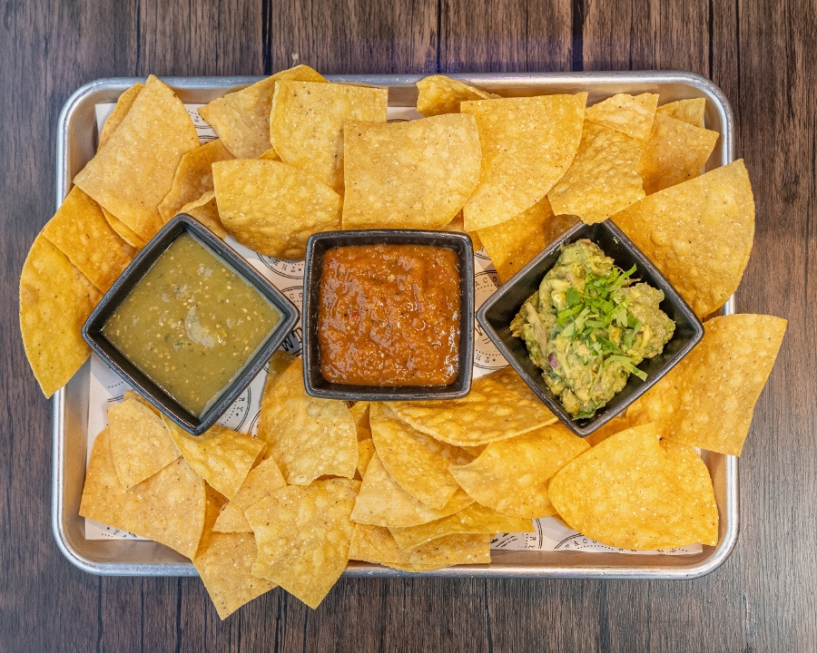 Corn tortilla chips with guacamole, salsa roja, and salsa verde