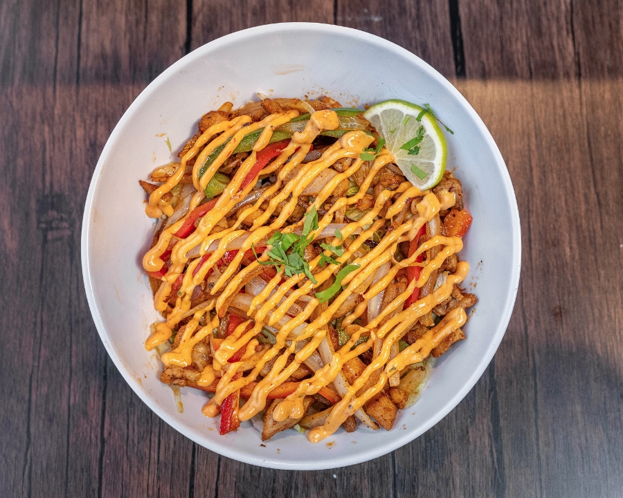 plancha grilled chicken, roasted red and green peppers, beans and special house sauce